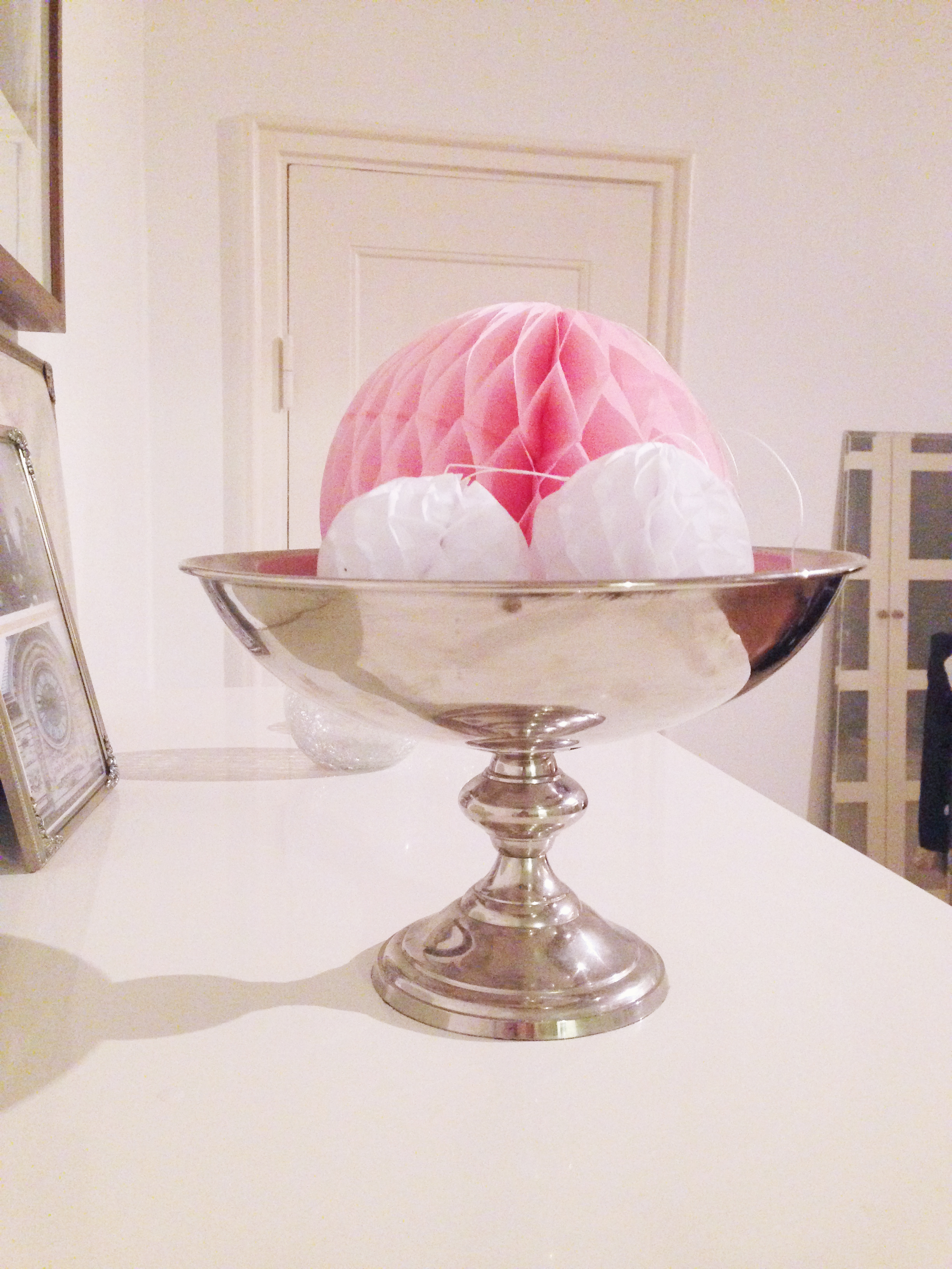 Och pom poms. Dessa tänkte jag hänga i taket ovanför sängens huvudända, men först ska jag pyssla ihop några fler honey combs själv. Det bästa är ju att själv välja färger och jag ska i dagarna pyssla ihop några egna honey combs. Så länge får dessa från Lagerhaus’ rea ligga och och pryda skålen på byrån.