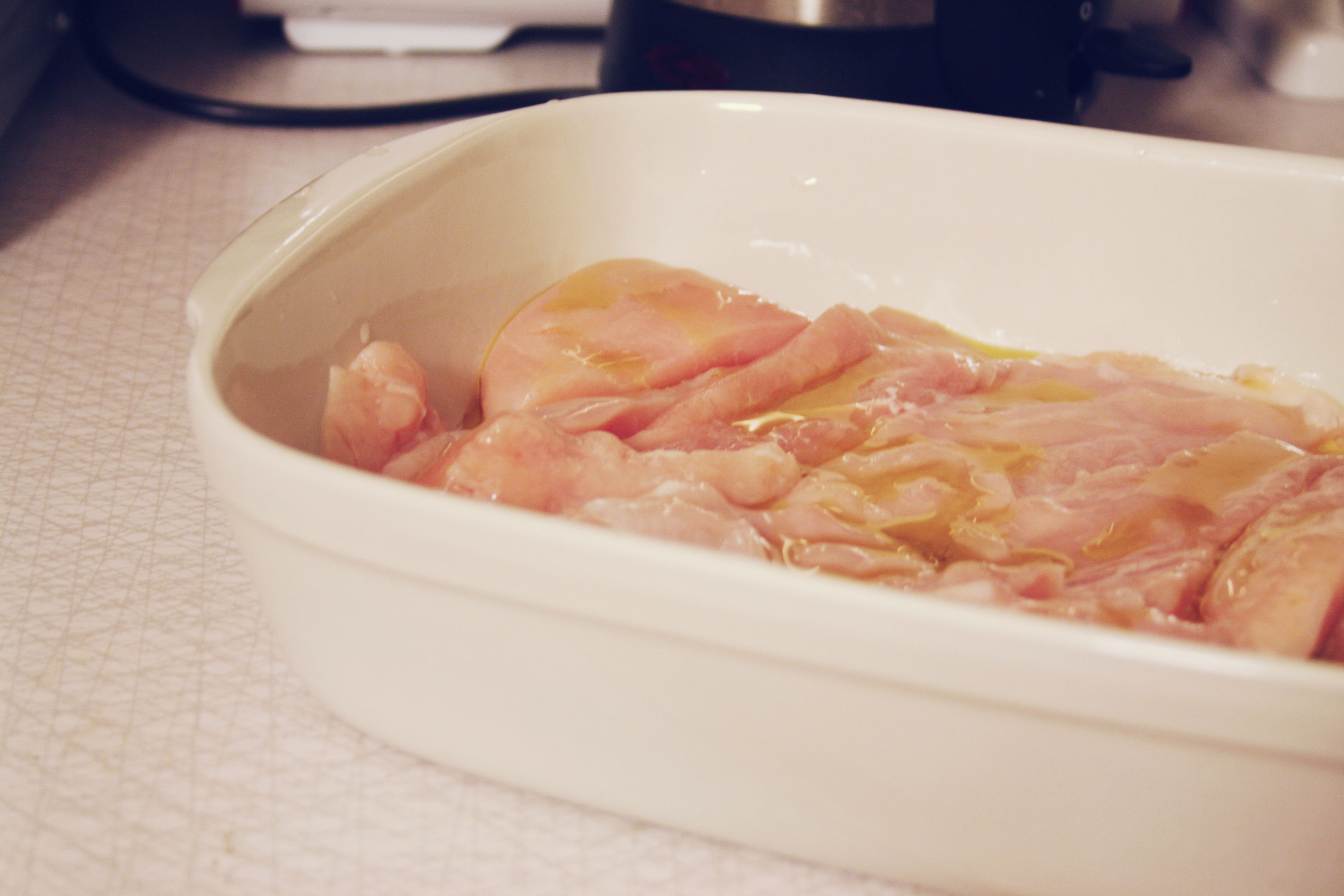 – Skär kycklingfiléerna i snett i hälften. Lägg i en ugnsform och ringla över lite olivolja.