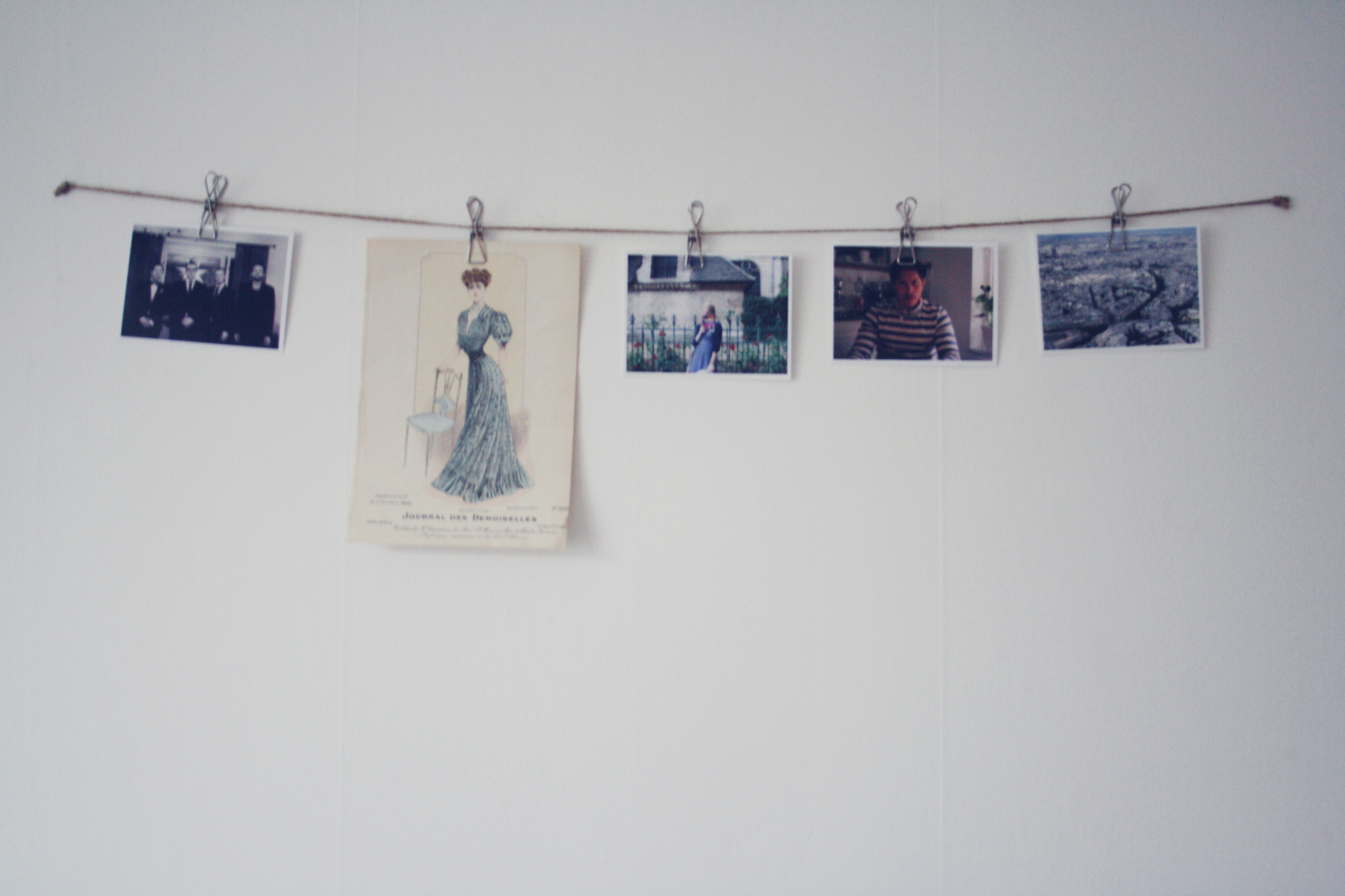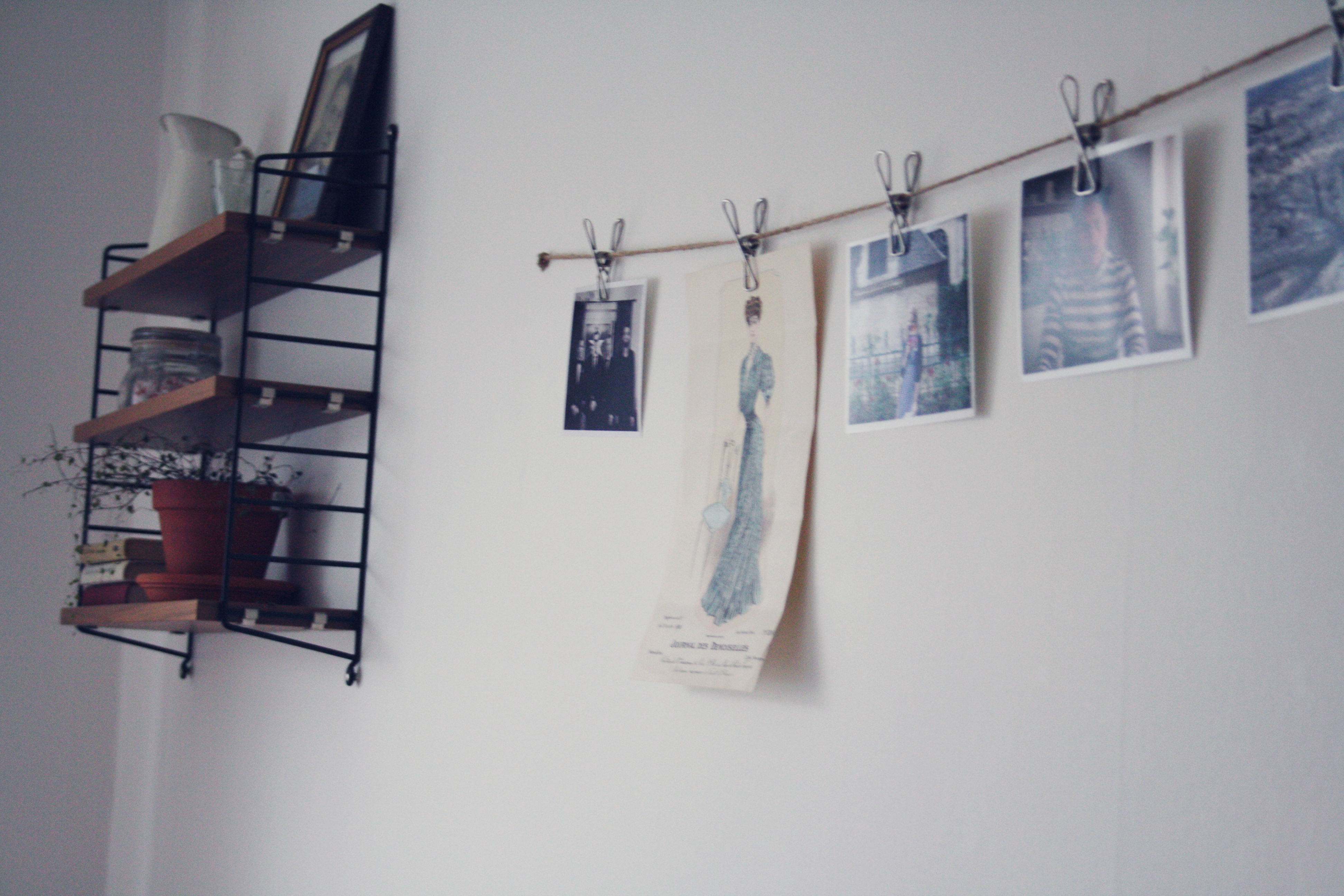 Helgens enkla pyssel utmynnade i vad jag skulle vilja kalla för en vykortsvimpel. Platsen ovanför tv:n kändes så tom, så vi köpte lite snöre och lite klämmor, mötte, spände och spikade. Det som kvalade in på platserna var en vintage modeaffisch från Paris, bilder från Paris och franskinspirerade motiv.