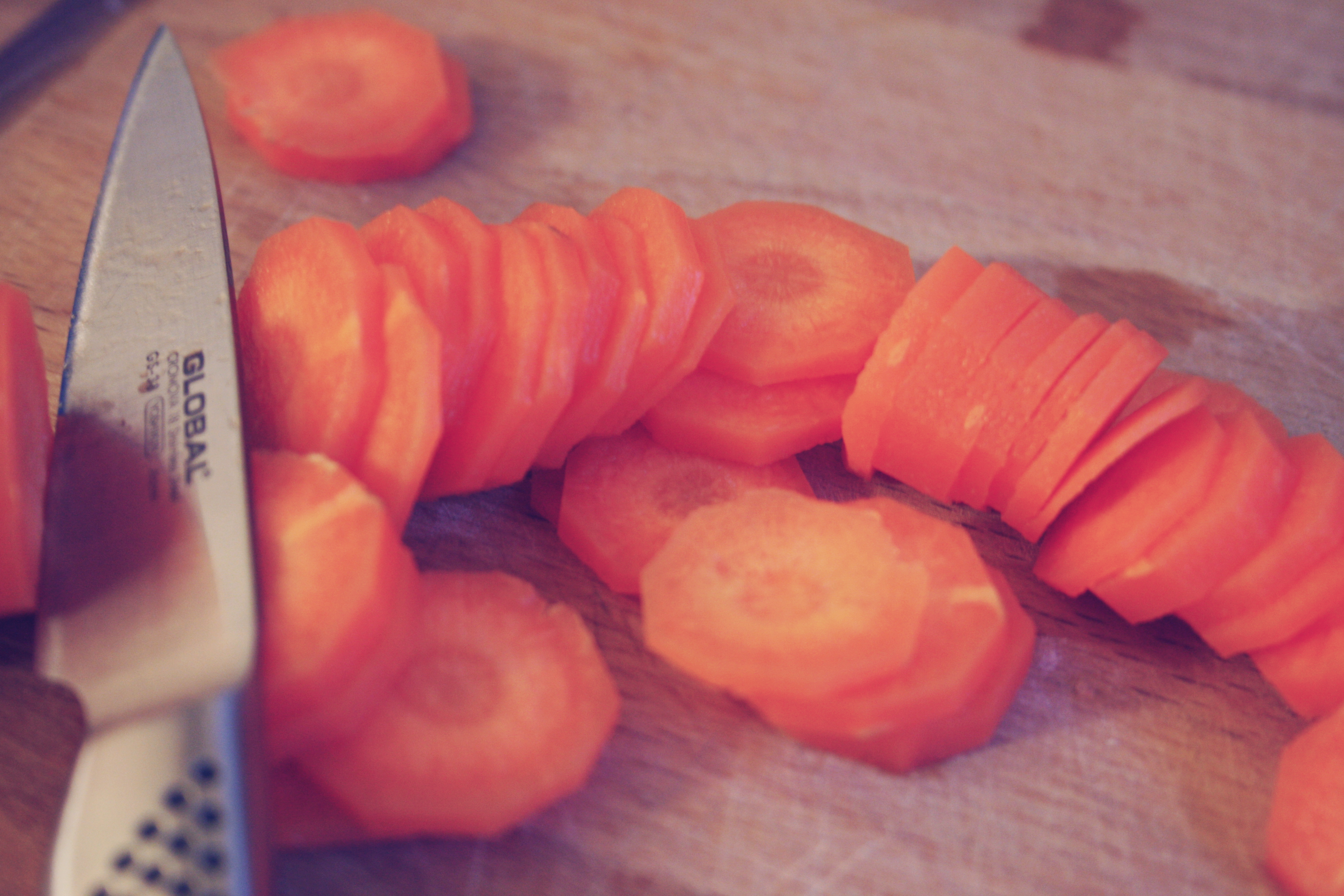 Värm upp olivolja, alternativt olivolja smaksatt med vitlök, i en stor kastrull. Tärna morötterna tunt och stek dem några minuter i oljan på medelvärme. Tillsätt sedan vinet och låt puttra en liten stund. Tillsätt sedan vattnet och låt koka upp, ha sedan i buljongtärningarna.