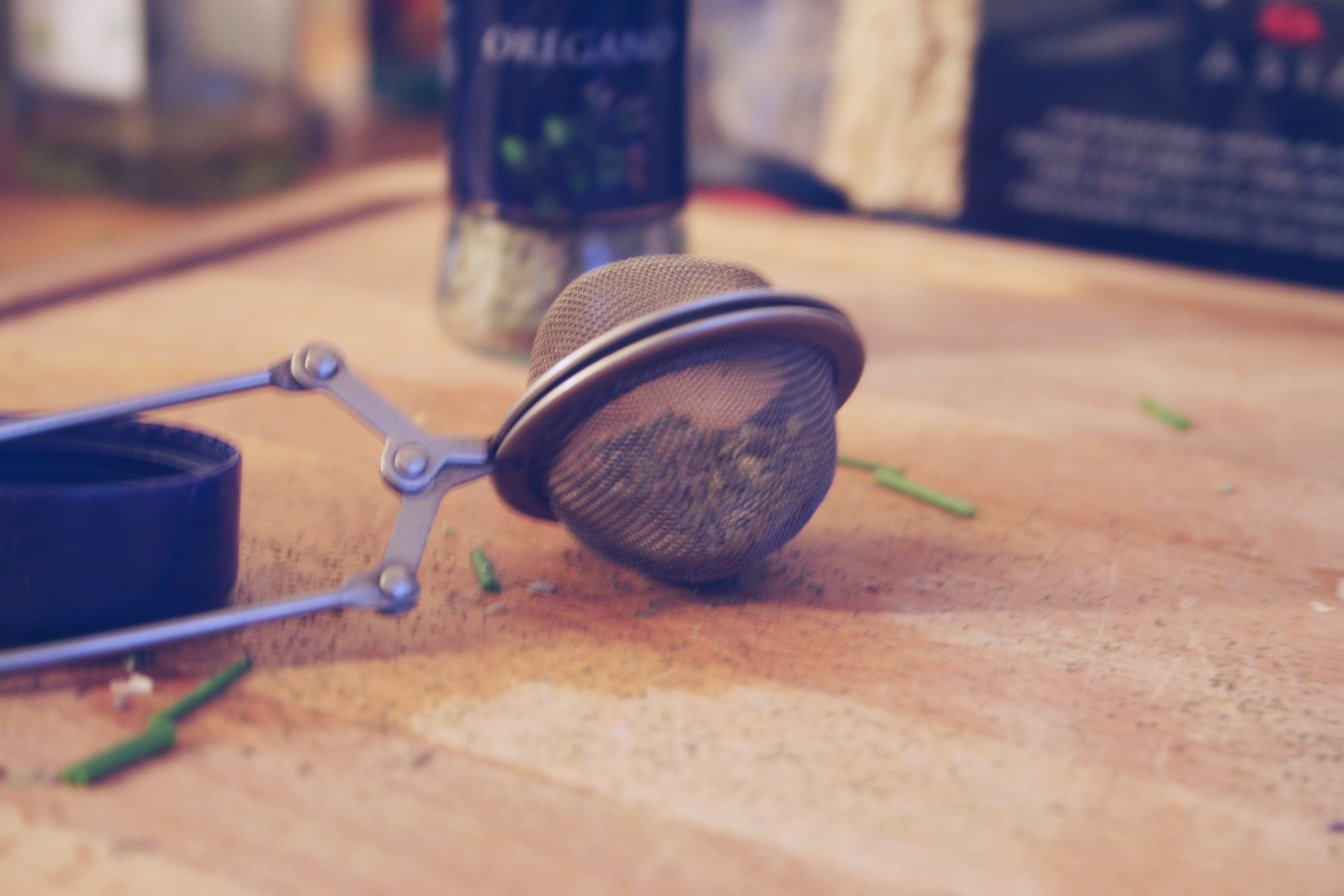 Här kan du göra två saker: antingen har du i kryddor (oregano, timjan och persilja) direkt i soppan, eller så lägger du dem i en tesil och låter dem bara dra i soppan en stund, samt salta och peppra. I det här steget hade jag även i grovhackad vitlök som fick ge soppan smak, och som jag sedan fiskade upp. För er som äter enligt FODMAP kan detta fungera om ni inte är jättekänsliga och om ni inte använde vitlöksolja i ett tidigare steg.