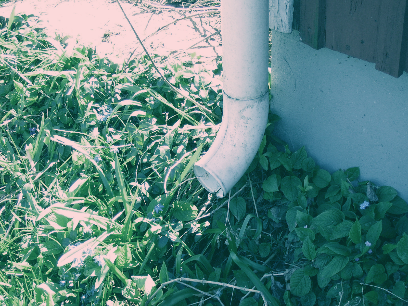 Men så hittade jag den här bilden. Jag minns inte att jag tagit den, men den känns ändå välbekant. Det verkar vara ett av mina första redigeringsprojekt. Fotot är i alla fall tagit vid en gullig liten fritidsstuga i mina hemtrakter i Hässleholm som heter Breida Blick, men jag har ingen aning om när. Det är minst sagt ett väldigt cyanfärgat foto, men jag gillade det här motivet – en gammal stupränna i ett vildvuxet dike om sommaren.