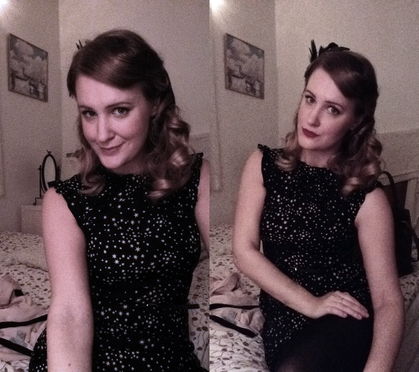 Kvällen kom och gästerna med den, så dags att fixa till sig. En stjärnbeströdd gammal klänning från Oasis, mjuka lockar och snabba fingerwaves i luggen och så ett fjäderspänne på det.