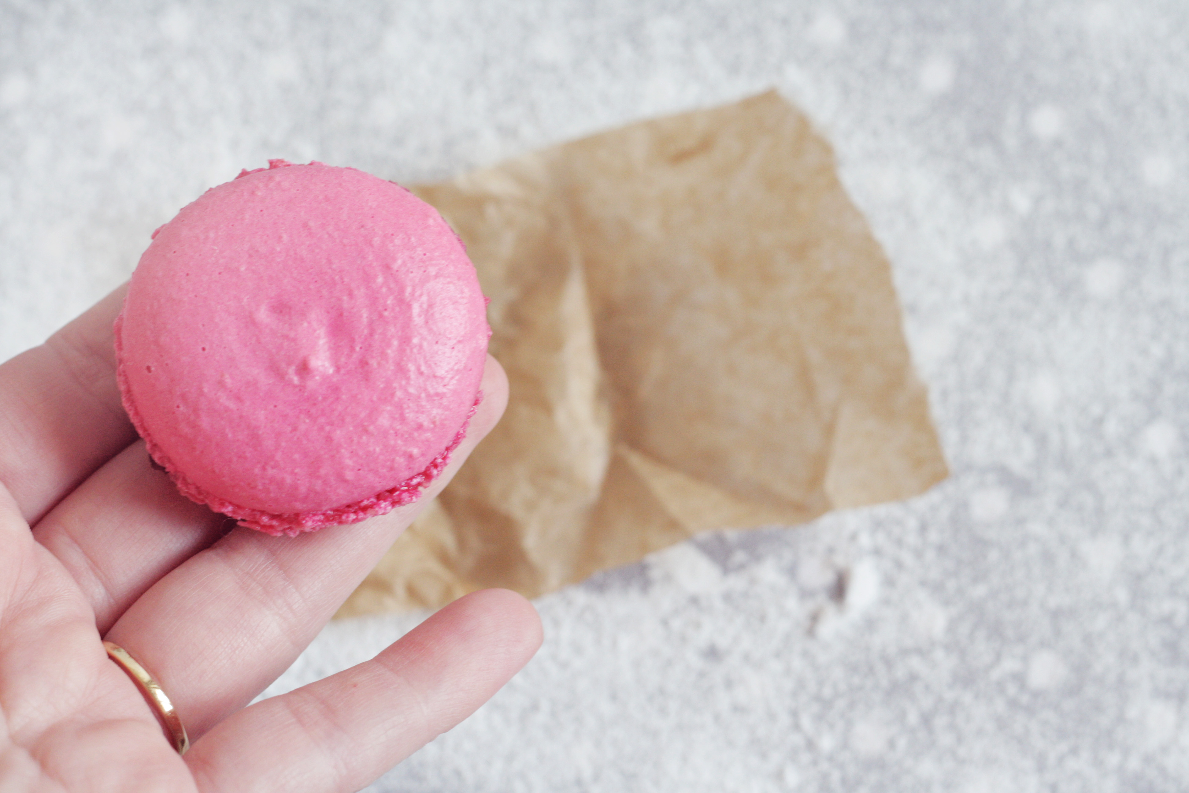 Väl hemma ställde vi oss för att baka macarons till en grej som händer senare i veckan. Bland annat gjorde vi en sort med smak av skogsbär, och guldstjärna i kanten för att vi dessutom fick chans att provköra vår ”nya” assistent från Kenwood.