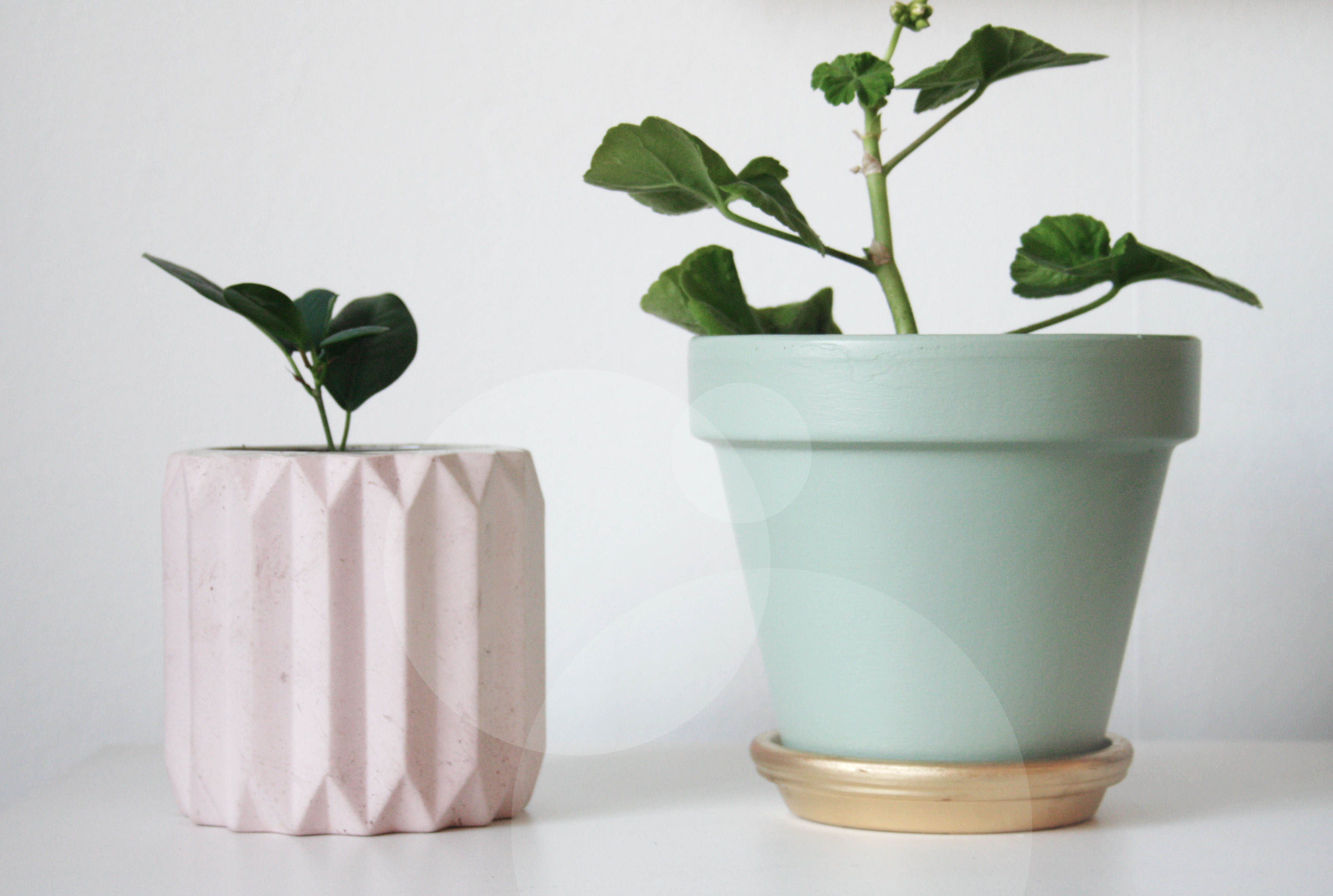 Sagt och gjort så drog jag fram en gammal tom kruka, den härliga havsskumsfärgen som blev över sedan jag målade om en pall i vintras och en burk guldspray som jag inte ens haft chans att använda än (eftersom det jag tänkt ha den till från början gick sönder). Min snälla sambo hjälpte mig med målningen, eftersom det inte kändes helt hundra med målarångår och en bebis i magen. Några lager färg senare var allt klart, och jag kunde plantera i en stickling från en ranglig pelargon som jag råkade bryta av häromdagen. Som redan har börjat knoppas! Ett mycket lyckat pyssel, med andra ord, och fasligt enkelt.