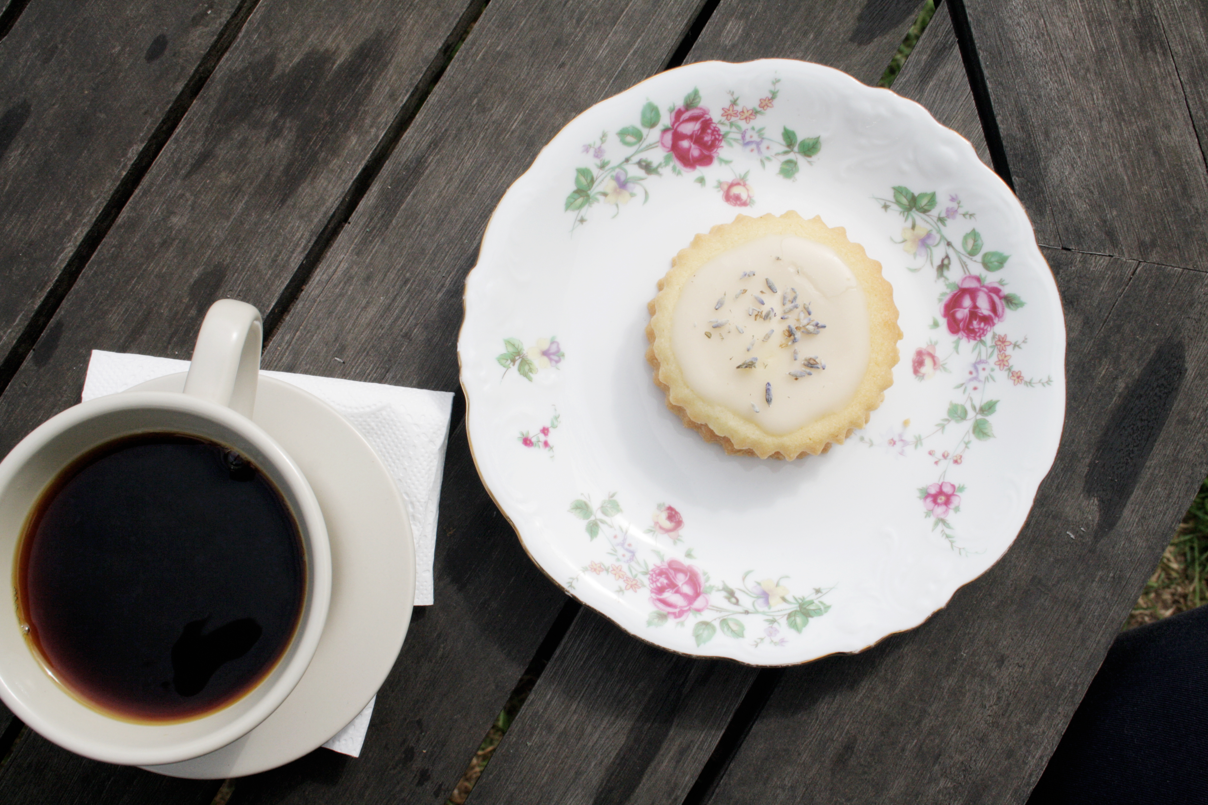 Besöket avslutades med en fika i trädgården. Sebastian tog en lavendelkaka och kaffe, jag en toscakaka gjord på honung och mandel och med hemmagjord fläderblomssaft till.