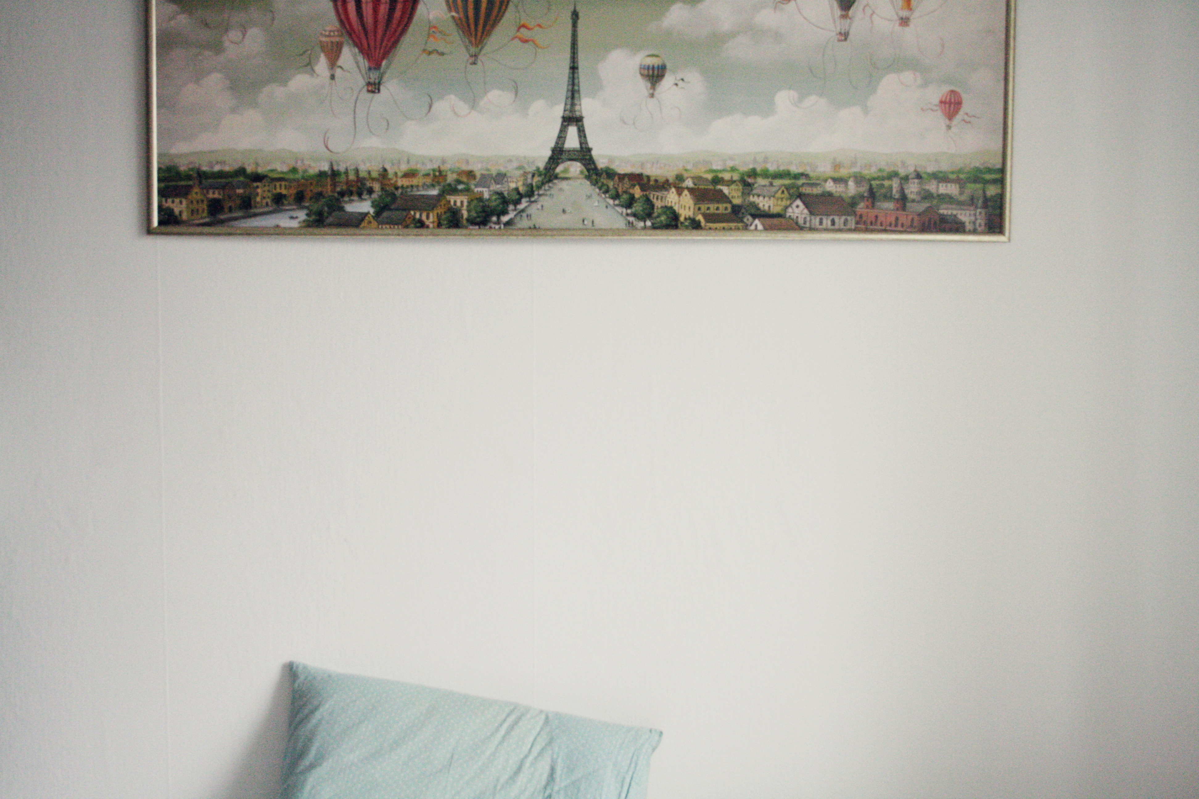 Och ja, jag fick ett smärre spel häromkvällen. Morrade åt Sebastian att nu har vi bott som nyinflyttade i nästan ett år, med tavlor stående längs väggarna istället för uppe på dem och med billiga fällstolar i plast kring köksbordet. Nu tar vi tag i det här, håller ögonen på Blocket efter möbler och hanterar vår konstsituation. Så kom det liksom bara över mig (inspirationen), att det var så klart att ballongfärden över Paris skulle sitta över vårt piano.